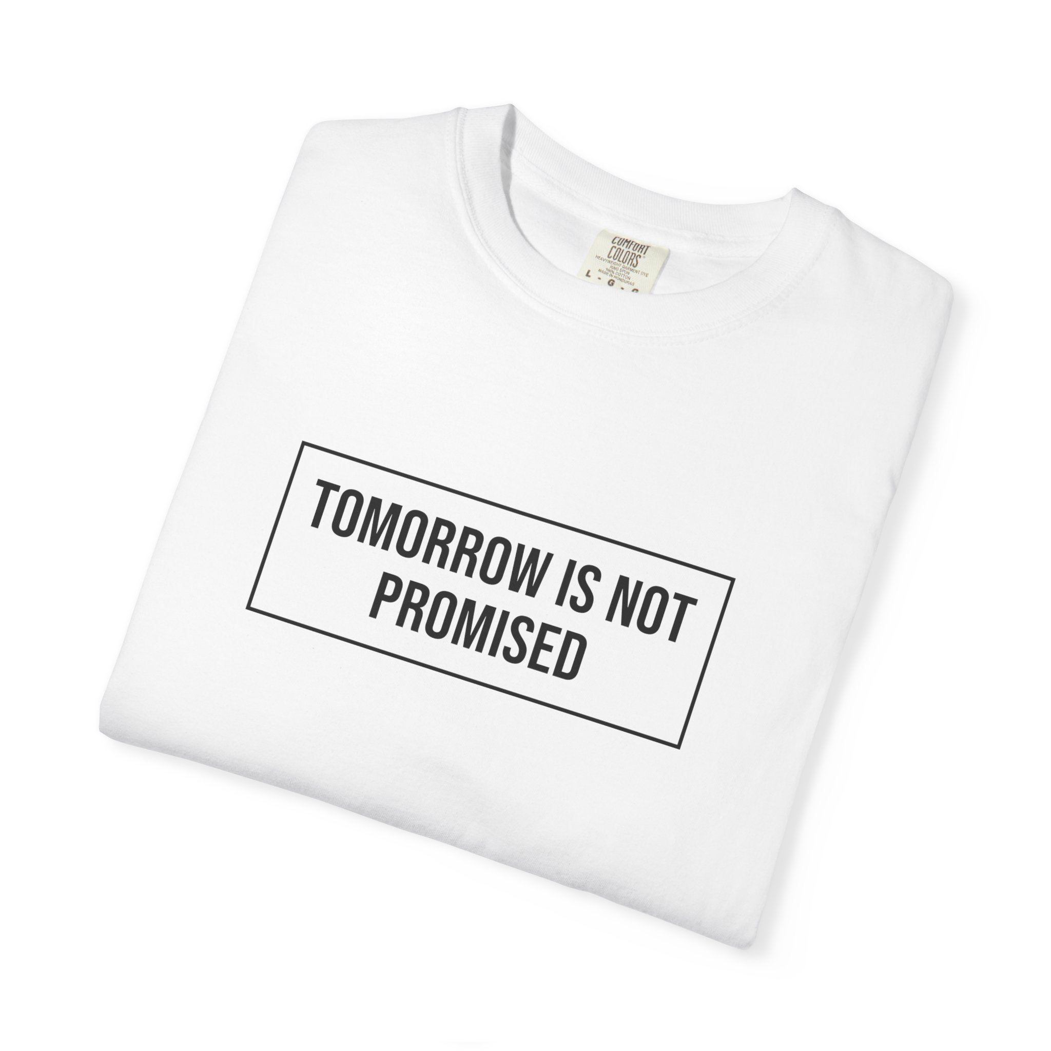 This relaxed, garment-dyed tee carries a quiet, hopeful message “TOMORROW IS NOT PROMISED” printed in clean, boxed typography across the chest. The heavyweight, ring-spun cotton softens with wear and wash, giving the shirt a lived-in comfort and gentle vintage feel. It sits loose across the shoulders and drapes easily over jeans, skirts, or layered under a jacket, becoming a subtle statement piece for someone who values calm confidence and everyday warmth. Wear it to low-key gatherings, morning coffee runs, or evenings around a backyard fire; the muted, softened color and minimal design keep the focus on the sentiment and the comfort of the fabric.